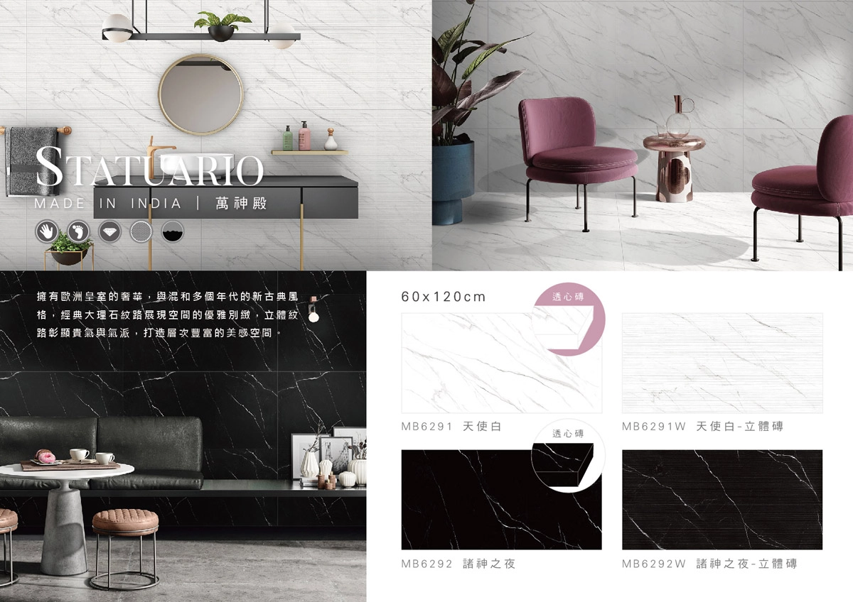 顏色包含白色與黑色系,白色常被稱為「天使白」或 Statuario,黑色則可見「諸神之夜」等深色調性,方便做明暗對比設計。